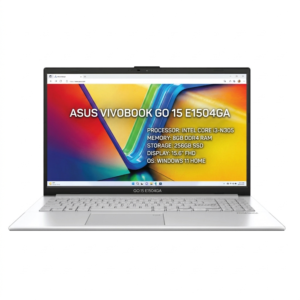 The ASUS Vivobook Go 15 E1504GA is a sleek and reliable everyday laptop designed to deliver smooth performance, modern features, and excellent value for students, professionals, and home users. Powered by the efficient Intel Core i3-N305 processor (13th Gen), this laptop is built to handle daily computing tasks with ease, including web browsing, office applications, online learning, video streaming, and light multitasking.